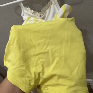 Janie & Jack one-piece swimsuit size 4. Yellow and white stripe bodice with halter style straps with yellow short-style bottoms. Very good condition, mild piling on bum.