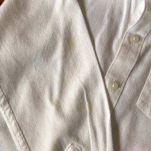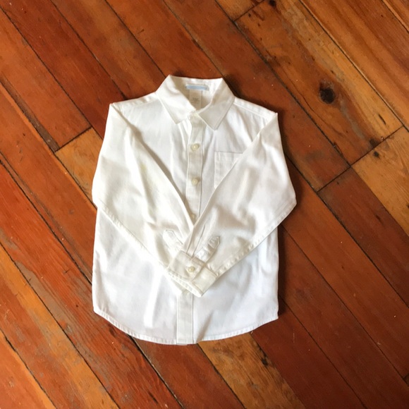 Janie & Jack boys white button down shirt size 4. Worn once. Has some yellow stains on one sleeve and one pink stain on other sleeve(see pictures). Probably can come off when washed. 100% cotton.