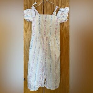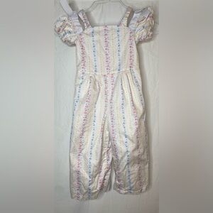 This adorable Janie & Jack overall is perfect for your little girl's wardrobe. It features a beautiful floral pattern on a white fabric that is sure to catch everyone's attention. The one-piece is designed for girls and comes in size 4. The overall has a stylish and comfortable fit, making it perfect for everyday wear. It is also great for special occasions where your little girl needs to look her best.