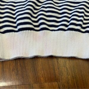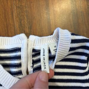Janie & Jack white/navy stripe embroidered cherries sweater. Button in back. Cuffs/hem have a slight tint of pink (I tried to photograph it as best I could). 100% cotton. Size 2T. Good condition!