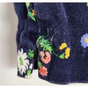 Dark blue with lots of flowers. The two front pockets are deep and ruffled on the edge. The bottom hem a small placket for ease of putting on a wiggling toddler. The back pockets are just for show. Zipper and button closure. Length is 17 1/2". The flat waist is 10".