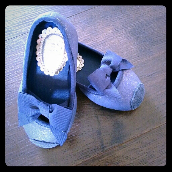 Beautiful navy blue ballet flats from Janie And Jack. Suede, glittery uppers, leather sole, grosgrain ribbon detail. No size printed on the shoes, but I would guess a size 5 from the Janie and Jack sizing chart (appropriate for a foot 4 3/4 inches long). The soles have some superficial marks--these were too narrow for my daughters to wear so are essentially brand-new. I can post measurements if needed.