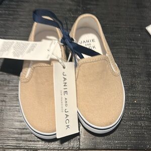 Chic slip-on sneakers by Janie and Jack. Beige canvas with navy accents. Perfect for everyday wear.