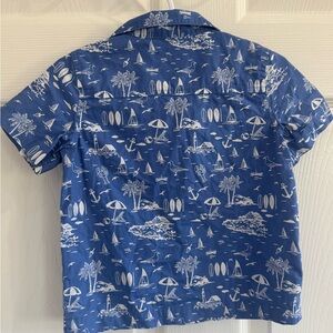 Charming blue button-down shirt with nautical designs. Perfect for casual outings. Comfortable and stylish.