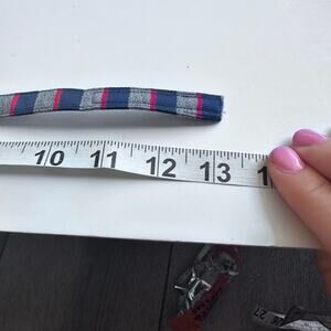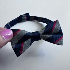 dashing bowtie features striped blue red and gray Permanently fastened in a classic knot.