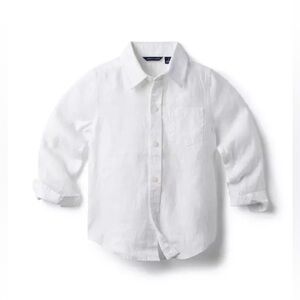 Janie and Jack Boy's White The Linen Shirt, size 5. This classic white linen shirt is perfect for warm weather occasions, offering a breathable and stylish option for your child. It features a full button-front, long sleeves with buttoned cuffs, and a single chest pocket. The shirt is designed for comfort and a sophisticated look, suitable for beach outings or dressier events. Excellent pre-owned condition.