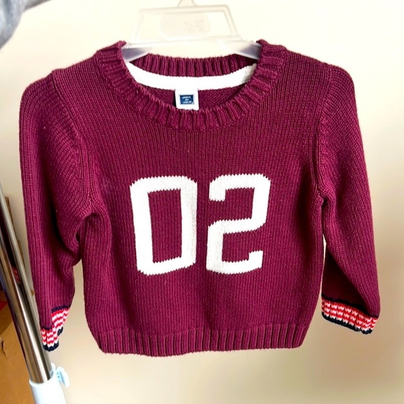 Stylish burgundy sweater. Features bold white number design. Ribbed cuffs and hem. Perfect for layering. Gender neutral can be for both girl and boy toddler kids