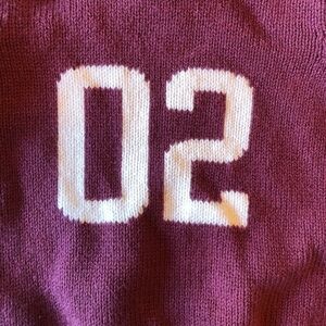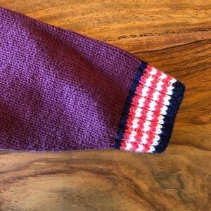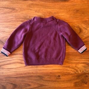 Janie and Jack burgundy & white crew neck sweater. Multi color stripe detail on cuffs. 54% cotton / 25% rayon / 21% nylon