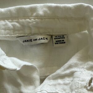 Stylish linen white button down shirt by Janie and Jack. Features a front pocket and button closure. Ideal for any occasion.