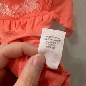 Janie and Jack long sleeve romper size 0-3 months. Coral solid with leaves embroidered on bodice and ruffles on shoulders. Super cute! Very good condition.