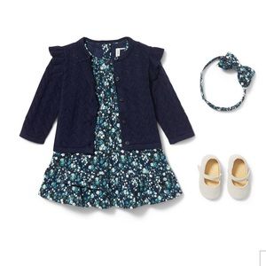 Her look isn't complete without this Navy Floral Corduroy Bow Headband by Janie and Jack. This soft bow headband is designed with florals and elastic back for all day comfort. At the time of this listing, the matching dress is available in my closet :)! From The Softest Snow Winter Series. NEW condition, but tag marked.