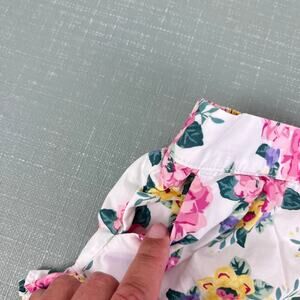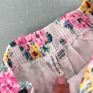 Janie and Jack Floral Ruffle Hem Short. Baby girl size 6-12 months. Pull on white shorts with pretty pink and yellow flower print. Features elasticized waist, ruffle hem, and pockets. 100% cotton poplin. Fully lined. Excellent condition.