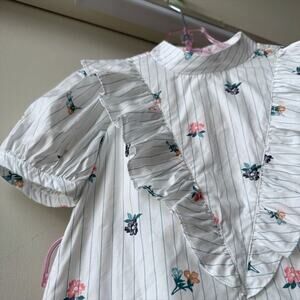 1. Striped ruffle floral blouse with puff sleeves. Button closure in the back. Stand up collar. Cotton poplin, fully lined.