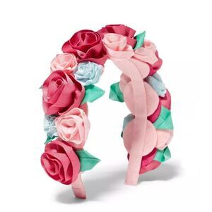 Flowers in her hair, flowers everywhere. This headband is sure to make any look bloom. Ribbon roses in shades of pink and blue are perfect for weddings, Easter and special occasions.