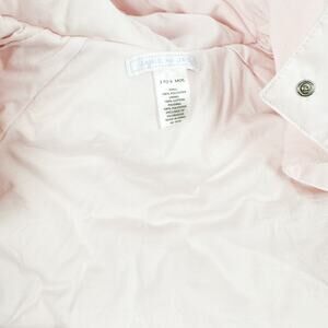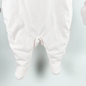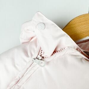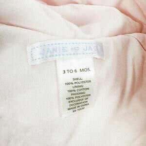 This is a cozy, warm pram suit by Janie and Jack in a light pink with attached mittens. Warmly padded with a soft cotton lining. Features a zip closure on left and right sides.