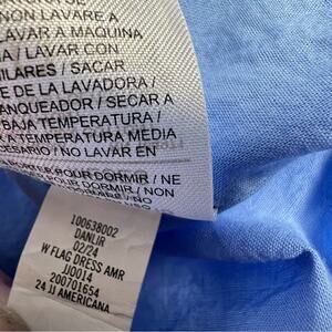 A sunny day dress with Americana style. Detailed with allover embroidered flags and ruffle details. Warm weather and sparklers await