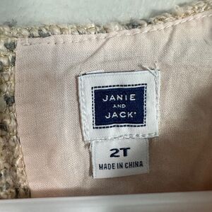 Adorable and elegant Janie and Jack dress in size 2T. This blush pink boucle tweed dress features short sleeves, with bow and ruffle details. Perfect for special occasions or stylish everyday wear.