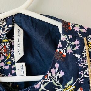 Janie and Jack girls navy floral swing top with gold piping and flare sleeves.