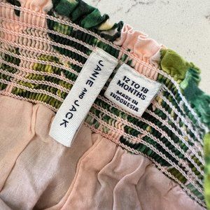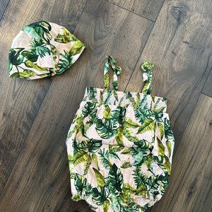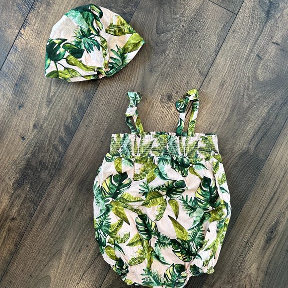 Janie and Jack bubble in pink with leaf print. Bubble has smocking at the top to help outfit stay up, and each strap has a small sewn in bow detail. Outfit has a coordinating hat. Hat has elastic in the back and a small knotted detail in the front. Brand new and never worn, just does not have tags. Original price was $60. Size 12-18 months.