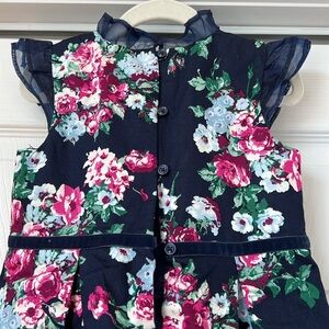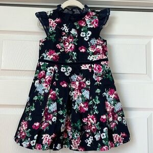 Adorable dress navy with floral design and ruffle details on neck and arm hems. Size 4