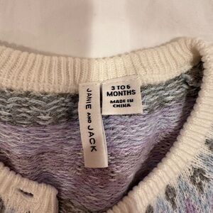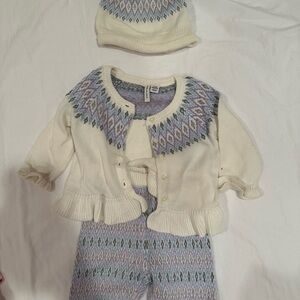 Adorable cream and purple knit baby outfit. Features a patterned cardigan and matching pants.