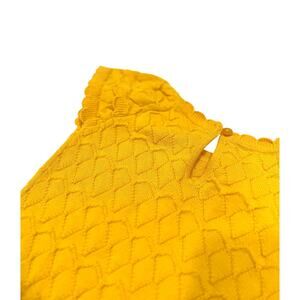 Janie and Jack yellow textured scallop sleeve sweater. Made from a blend of 59% cotton and 41% polyester, this sweater is incredibly soft and comfortable for all-day wear. The scallop sleeve detail adds a touch of charm and sophistication to this versatile piece.