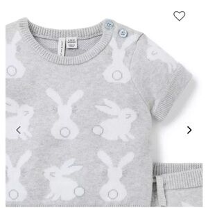 Adorable gray matching set with bunny design. Includes short-sleeve top and shorts. Soft and comfortable fabric.