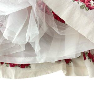 Elegant white duppioni silk dress with lavish red rose floral on skirt. Fitted top with cap sleeves. Red velveteen sash and bow at waist. Inside lining and tulle-enhanced petticoat offer extra pop.