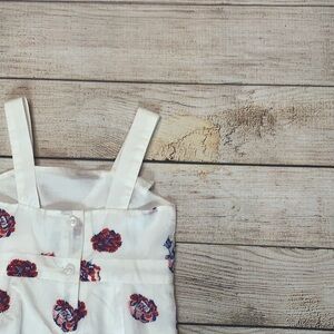 Janie and Jack baby girl red, white, blue jumpsuit romper, new with tags. Adorable for 4th of July or summer parties. Size 6-12 months. Soft cotton material, lined, buttons up the back.