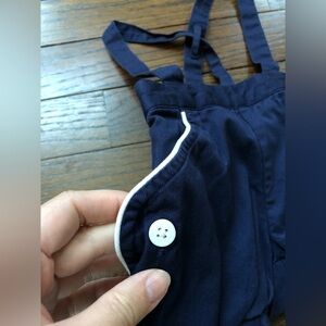Details: 100% cotton. Overall shorts with adjustable straps. White accent piping with button design. Pockets. Elastic hem shorts. Janie and Jack Layette formal line.