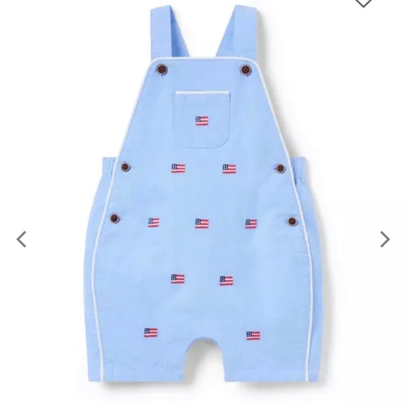 Charming light blue overalls with flag accents. Ideal for fun outings.