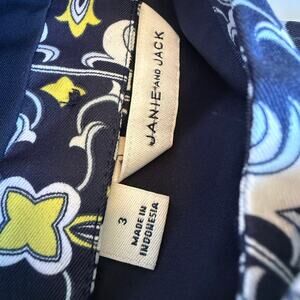 Size 3, Janie and Jack, Medallion Scarf Print Dress. Gently puffed sleeves, bow at the neck, button back and fully lined. 100% Polyester. No stains or flaws, like new, excellent used condition.