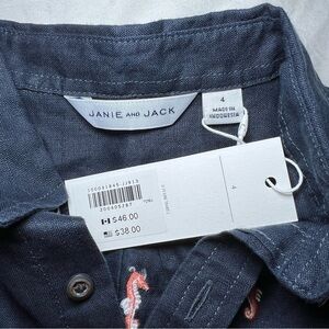 Janie and Jack shirt - New with Tags. $38.00. Navy Blue Button Down Shirt with Embroidered Sea Horses, 3/4 Sleeve, 100% Linen, Boys Size 4