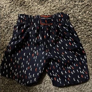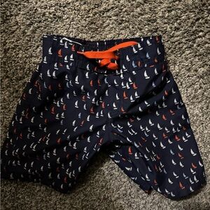Stylish swim trunks with sailboat pattern. Features a vibrant orange drawstring. Perfect for beach days.