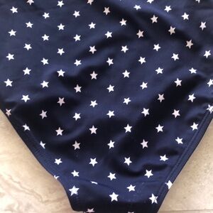 Navy one piece with white star pattern. Ruffled sleeves with red and white accents.