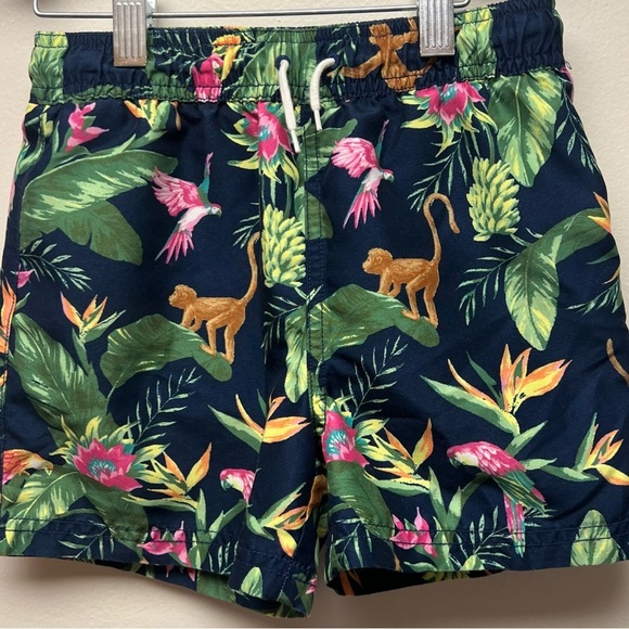 Navy swim shorts with vibrant tropical design. Features monkeys and birds. Perfect for swimming.