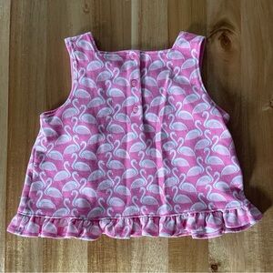 Adorable pink top with flamingo pattern. Features ruffle trim and button detail.