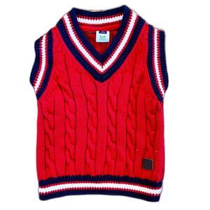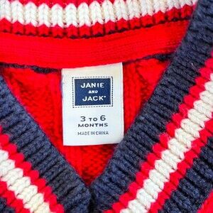 Janie and Jack Red Cable Knit Vest V-Neck Blue Stripe Trim 3-6mos