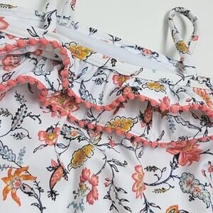 Floral print, one piece swimsuit from Janie and Jack. Features ruffled details with tiny pom ribbon trim. Done in white and a peachy pink salmon colorway.