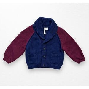 Cranberry and blue shawl-collar cardigan from Janie and Jack in size 6-12 months. Two little front pockets. 100% cotton and in great condition with no flaws.
