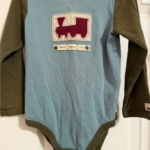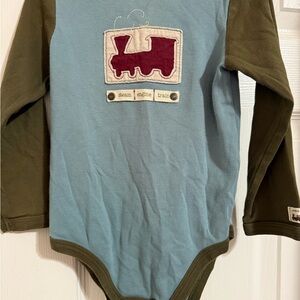 Long sleeve blue and green bodysuit with a train appliqué on front