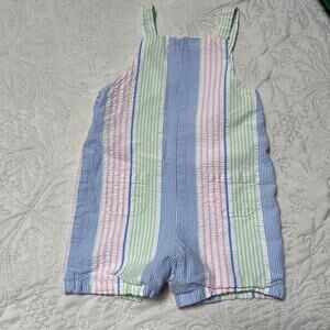 Janie and Jack striped seersucker overalls. Shortall style in pastel and white stripes. Very good condition. Size 12-18 months.