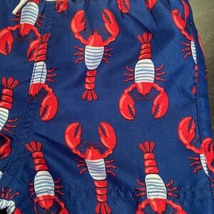 Slight mark on the front inside liner— these were always worn with a covered swim diaper. Color is navy blue with red lobsters.