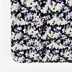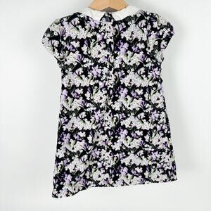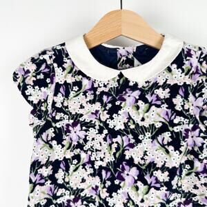 This is a short sleeve dress by Janie and Jack in a soft velvet with an all-over floral print of white flowers and purple violets. Features a classic peter pan collar.