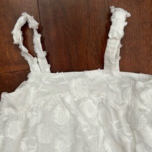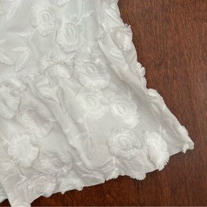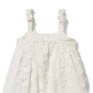 Charming white sleeveless dress with three dimensional floral details. Perfect for any occasion.