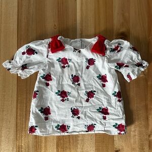 Janie and Jack White and Red Floral Puff Sleeve Blouse with Velvet Bows