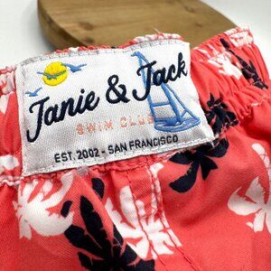 Adorable Janie and Jack swim trunks featuring a charming palm tree design, perfect for your little one's beach adventures. New with tags, these trunks are designed for comfort and style, ensuring your baby looks fashionable by the water.