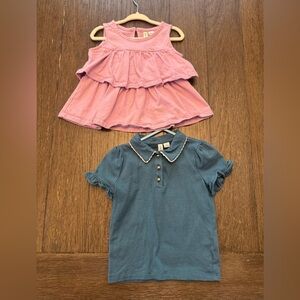 Adorable set of kids tops featuring a pink sleeveless ruffle top and a blue collared shirt. Perfect for any occasion.