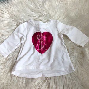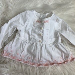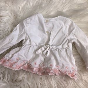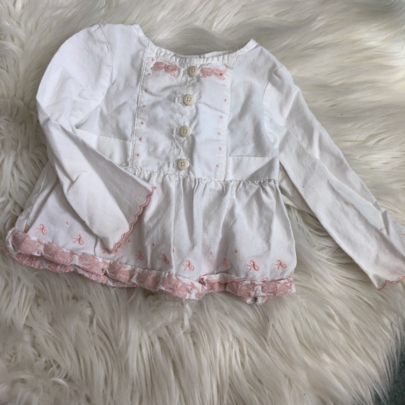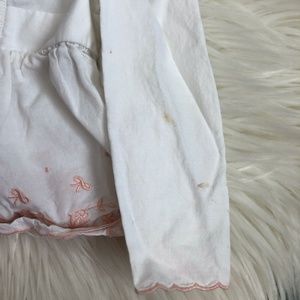 Gently used Janie and Jack top size 6-12 months. White with pink embroidery. There is a small mark on the sleeve as shown in the photos (may come out with a bleach pen!). Ties at the back.