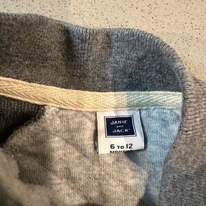 Janie and Jack zip up grey jacket with brown patches on elbows. Size 6-12 months